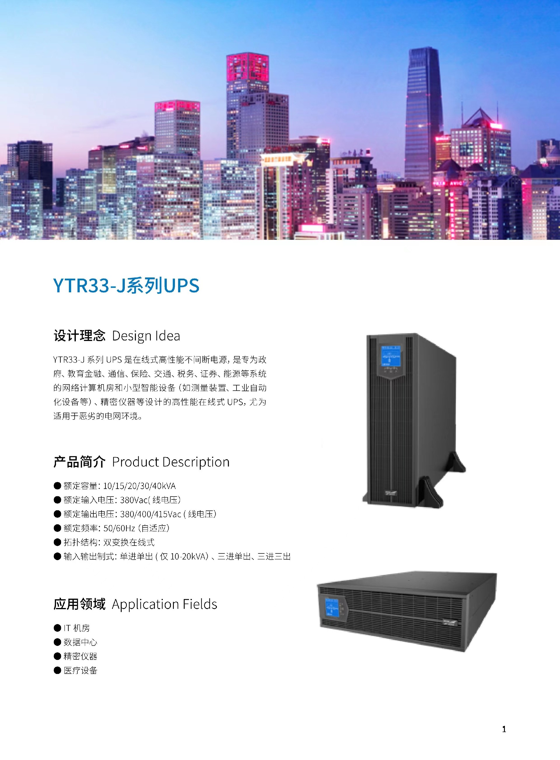 YTR33-J系列 UPS 是在线式高性能不间断电源,是专为政府、教育金融、通信、保险、交通、税务、证券、能源等系统的网络计算机房和小型智能设备(如测量装置、工业自动化设备等)、精密仪器等设计的高性能在线式 UPS,尤为适用于恶劣的电网环境。
