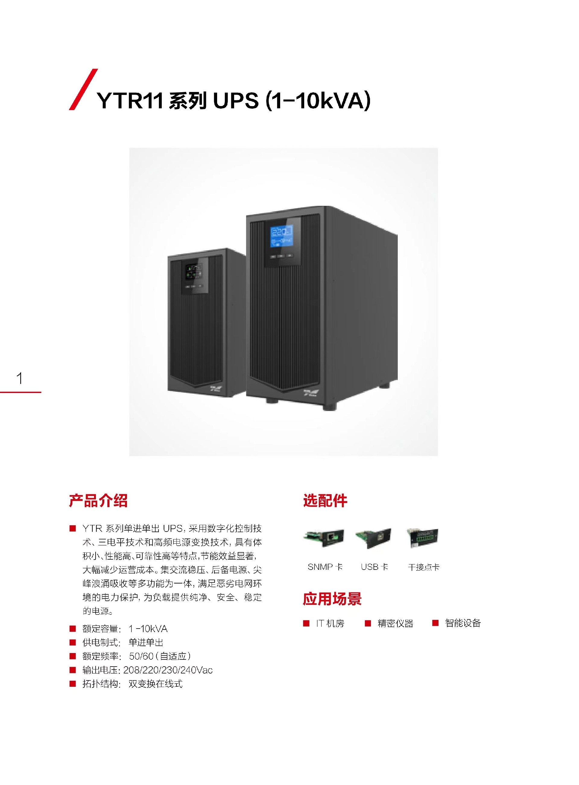 YTR 系列单进单出 UPS,采用全数字化控制技术和*新高频电源变换技术,具有高效率、高功率因数等特点,节能效益显著,大幅减少运营成本。集交流稳压、后备电源、尖峰浪涌吸收等多功能为一体,满足恶劣电网环境的电力保护,为负载提供纯净、安全、稳定的电源。