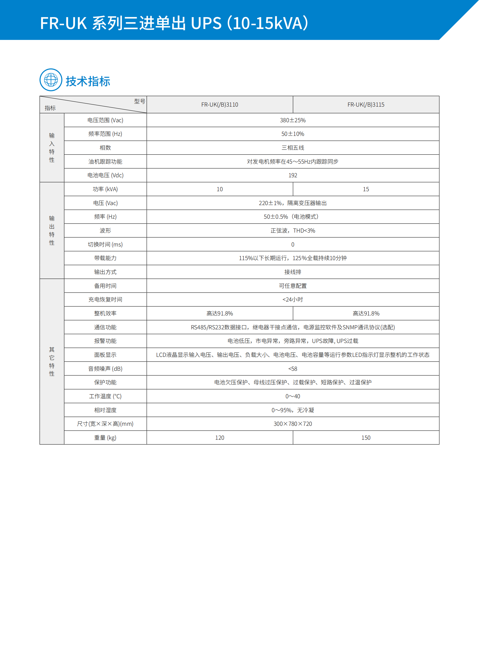 FR-UK31系列UPS(20-40kVA),输出标配隔离变压器,适用于政府、金融、保险、能源、教育、企业等行业,可为中小型数据中心、通信机房、网络间、营业厅、实验室、仪器室、控制室、计费中心、精密控制室、过程控制中心的IT设备提供安全的电源保障。